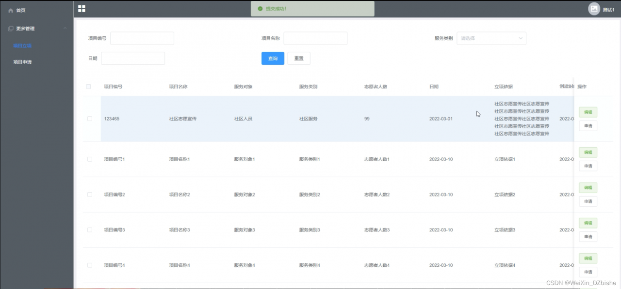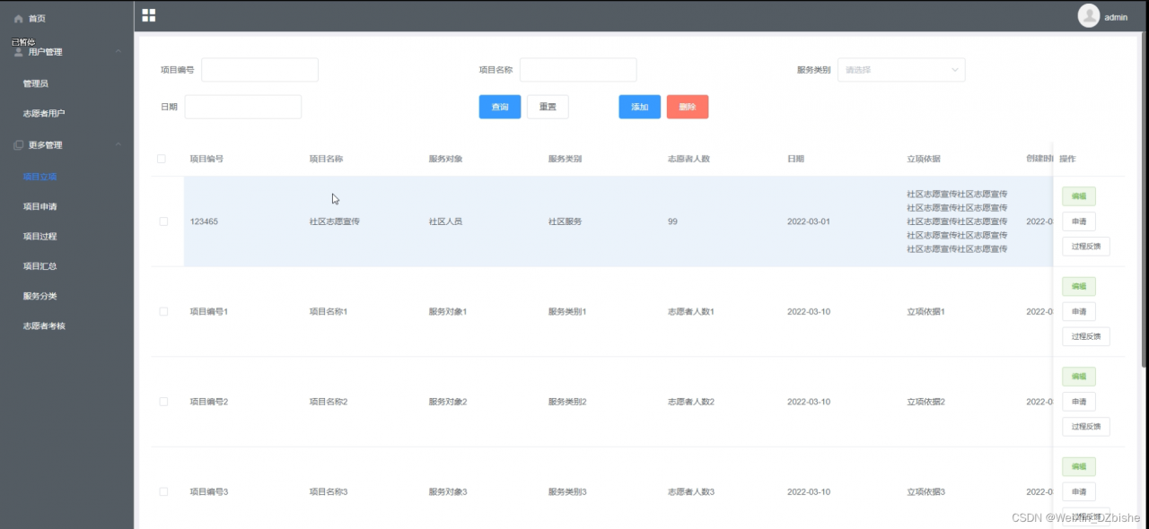 项目立项页面可以搜索项目编号、项目名称、服务对象、服务类别、志愿者人数、日期、立项依据等详情信息等操作。
