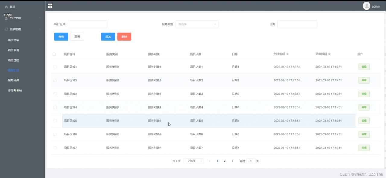 项目汇总添加功能主要指对其项项目区域、服务类别、服务对象、项目人数、日期等一些基本信息的编辑、查询添加、删除和修改。