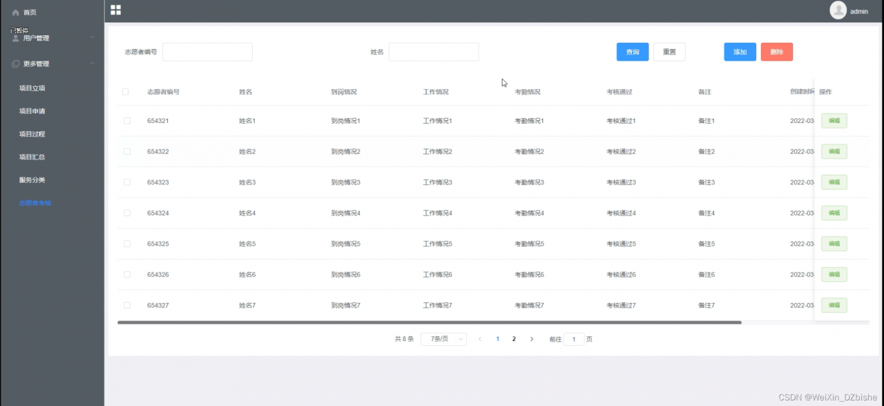 志愿者考核添加功能主要指对其志愿者编号、项目、到岗情况、工作情况、考核通过、备注等一些基本信息的编辑、查询添加、删除和修改。