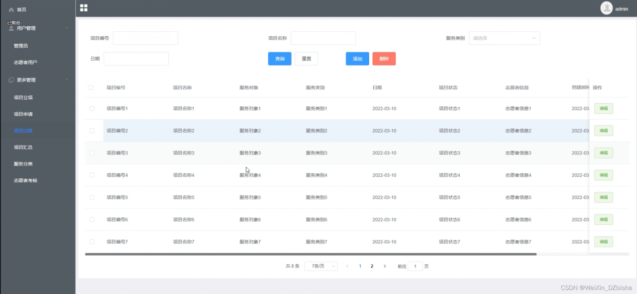 项目过程信息添加功能主要指对其项目编号、项目名称、服务对象、服务类别、日期、项目状态、志愿者信息等一些基本信息的编辑、查询添加、删除和修改。