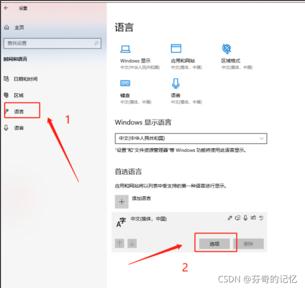 3、点击“语言”-选择中文(简体,中国)点击“选项”。