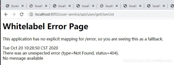 请求:http://localhost:8092/user-service/api/user/getUserList ,原因:因为yml配置了:ignored-services: user-service,所以不能采用服务名称为匹配路径