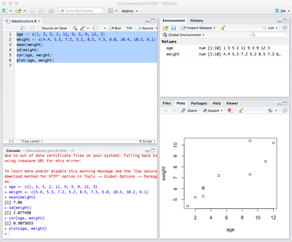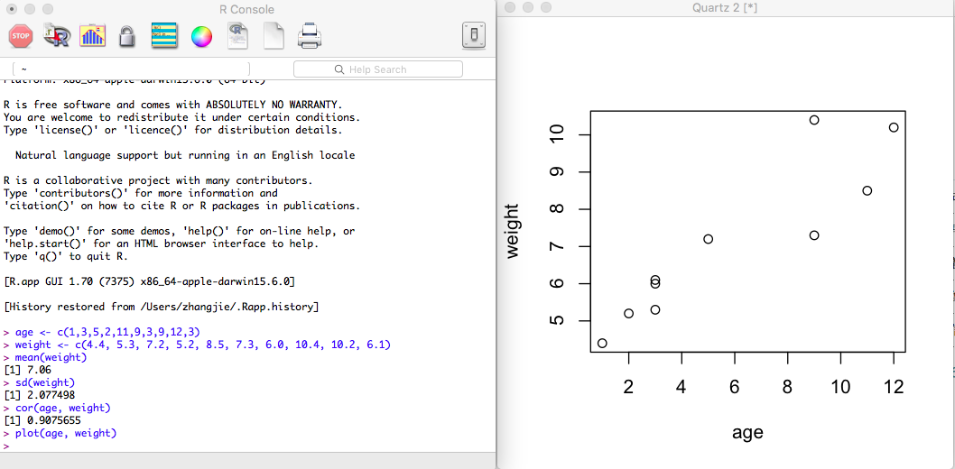 安装好打开后就照着《R语言实战》中敲了个例子,这种即时能看见结果的事情对我来说还是很受用的。
