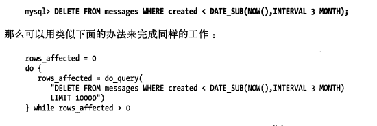 如果 用一个大语句一次性完成可能需要一次性锁住很多数据,占用整个事物日志、占用系统资源、阻塞一些很小但很重要的查询,将一个大的DELETE切分,例如需要每个月运行一次下面语句: