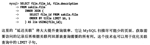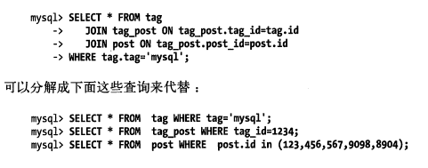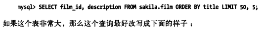 d、提高查询本身效率:如上例子使用IN()代替关联查询,可以让MySQL按照ID顺序进行查询,比随机关联更高效;