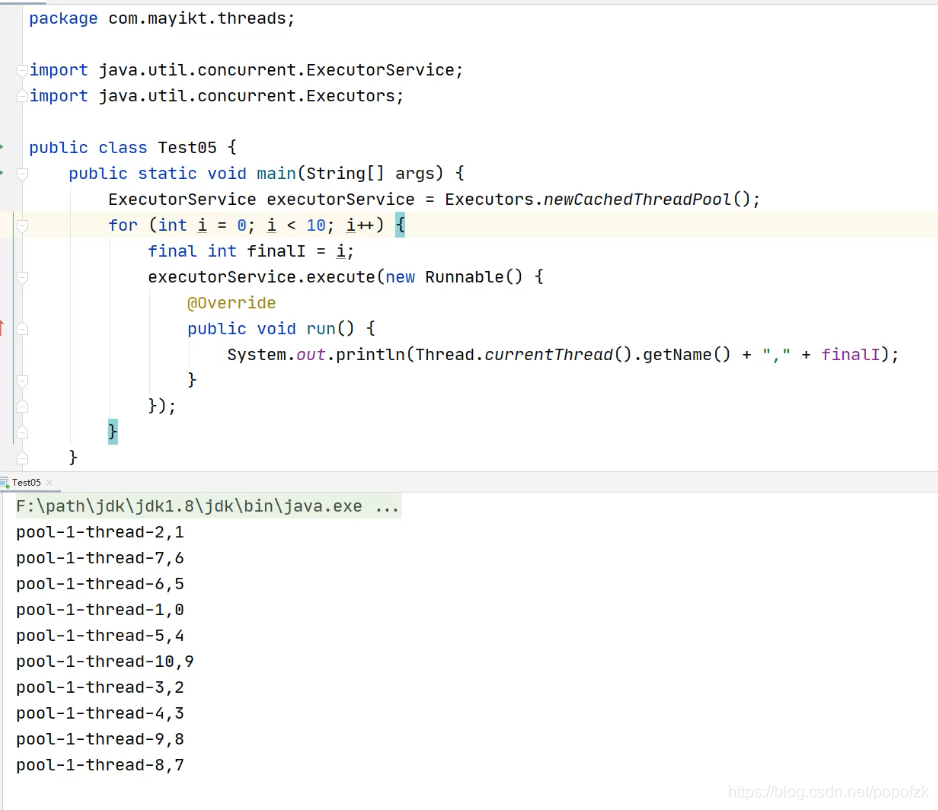 System.out.println(Thread.currentThread().getName() + "," + finalI);