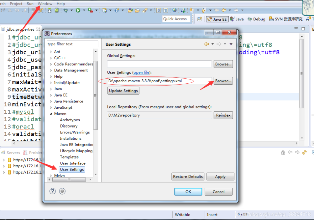 - 修改eclipse中的路径----红圈中的路径即为maven中的settings的路径,选择后下边的Local Repository自动变为你所指定的仓库