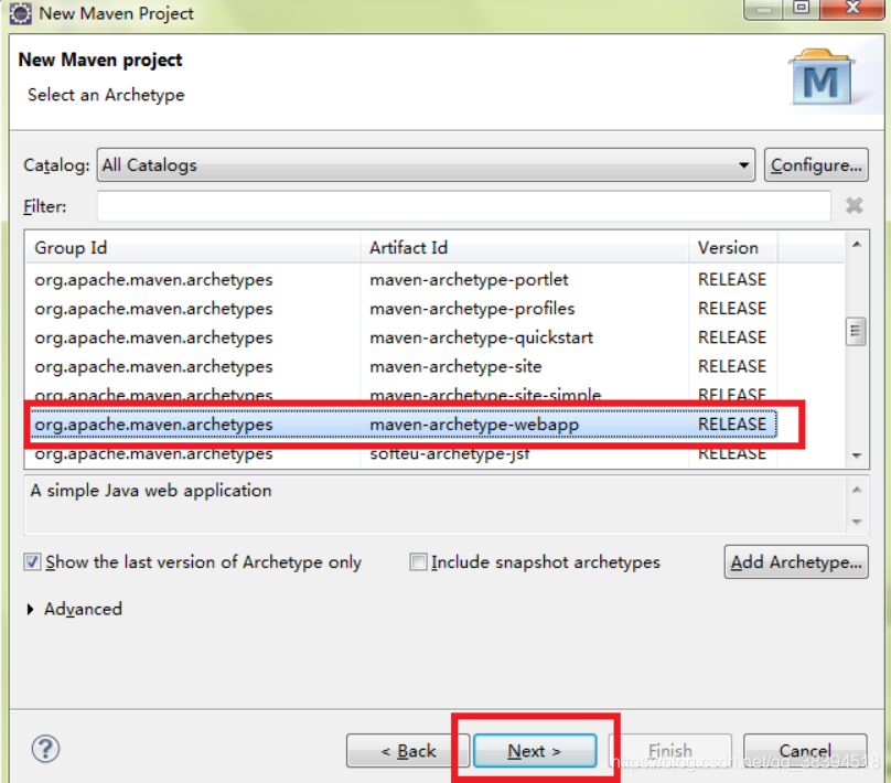 3.选maven-archetype-webapp后,next