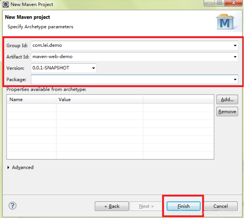 4.填写相应的信息,Group Id 为网址域名倒置如:com.ccbc ; Artifact Id 为项目名如opcpPackaged是默认创建一个包,不写也可以,会自动将域名+项目名作为包名