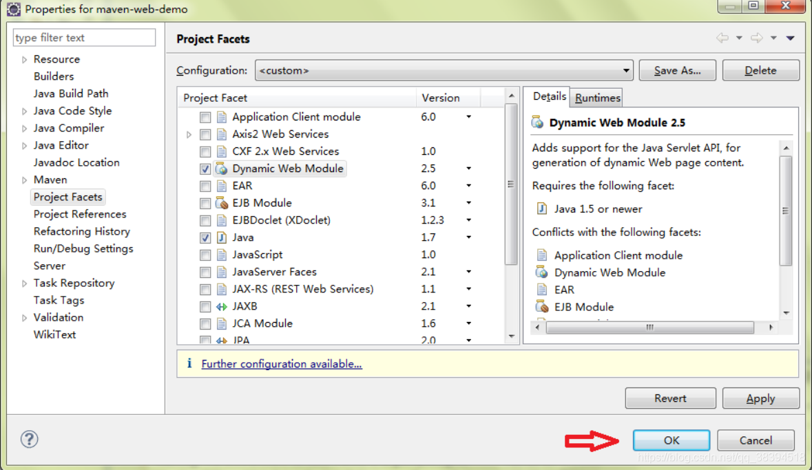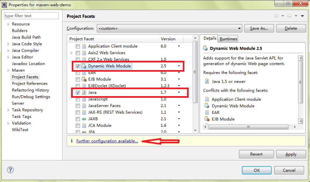 8.修改Java为你当前项目的JDK,并添加Dynamic Web Module ,最后单击”Further Configuration available“ 链接: