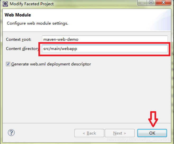9.修改Content directory 为 src/main/webapp ,单击OK:
