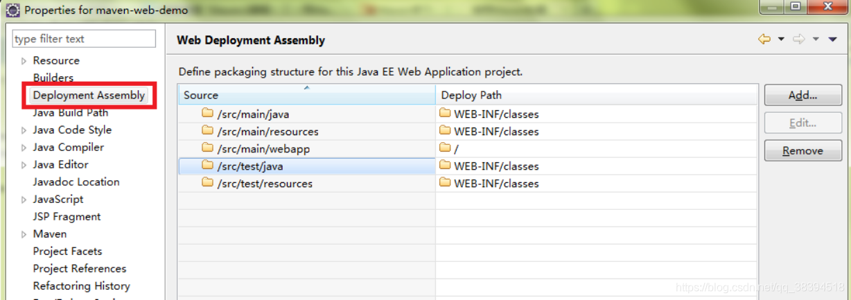 在项目上右键单击,选择Properties,在左侧选择Deployment Assembly