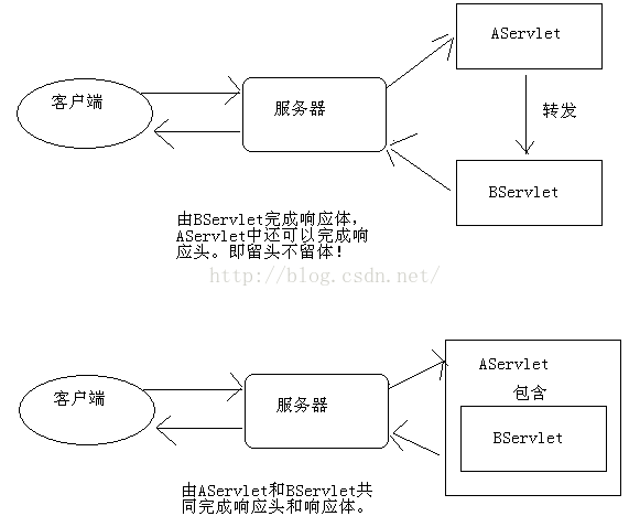 (1)如果在AServlet中请求转发到BServlet,那么在AServlet中就不允许再输出响应体,即不能再使用response.getWriter()和response.getOutputStream()向客户端输出,这一工作应该由BServlet来完成;如果是使用请求包含,那么没有这个限制;