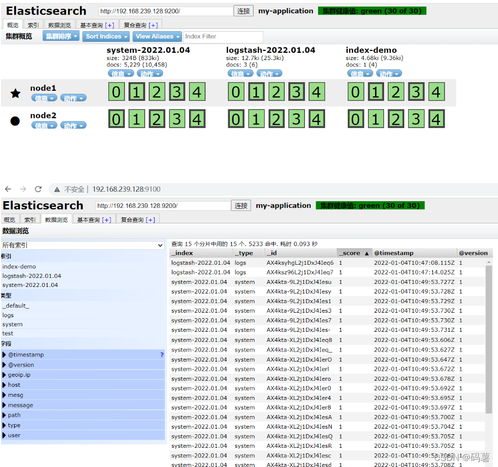 6.#浏览器访问http://192.168.239.128:9100/测试,查看索引信息能发现
