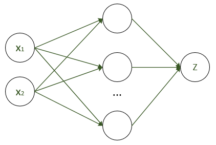 输入为 x1, x2,输出为 z,中间层数量待定,现需要训练网络,使得各个箭头获得合适的权值,以拟合我们的目标式子。