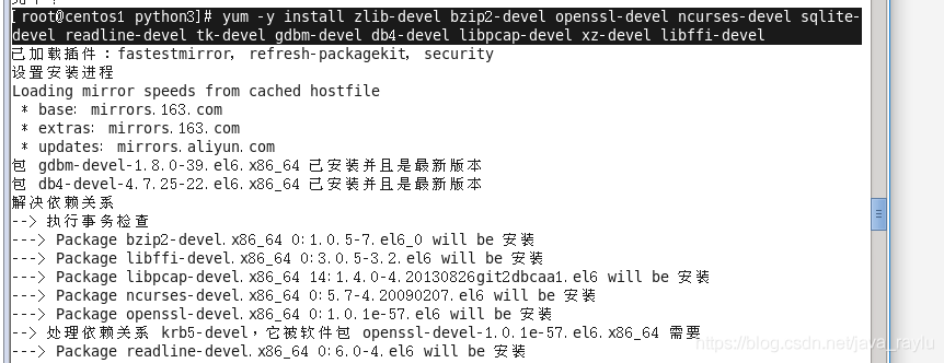 3.安装其他依赖包(可以不安装,但是可能会安装过程中报错):yum -y install zlib-devel bzip2-devel openssl-devel ncurses-devel sqlite-devel readline-devel tk-devel gdbm-devel db4-devel libpcap-devel xz-devel libffi-devel