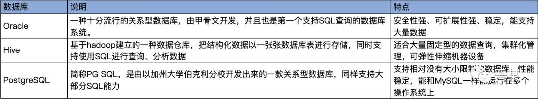 平常所接触到诸如Oracle、Hive、PG等,其实这些都属于关系型数据库,本质上都是建立在SQL(结构化查询语言)的基础上,所以最大的特征就是结构化。这些适合大量的数据查询,统一提供增、删、改、查、排序等多种查询。数据库类型有很多,以下仅列举常遇见的3种: