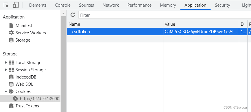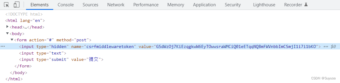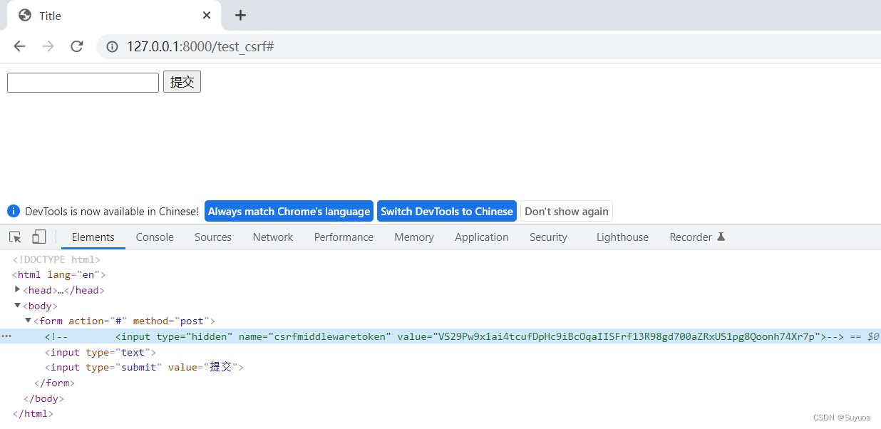在网页源代码中可以看到一个名为csrfmiddlewaretoken的input,这个input是隐藏的,这里的input的值与cookie值是配套的