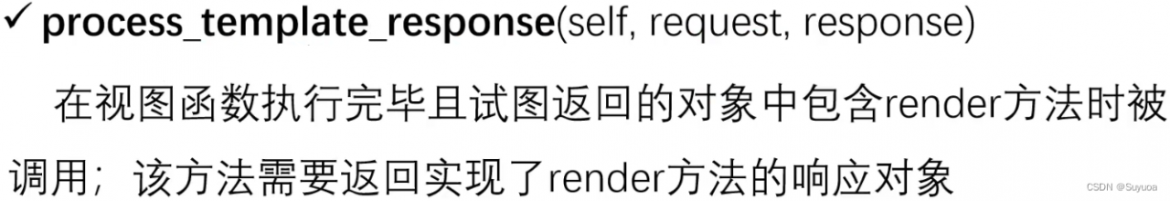 - process_template_response的render方法指的并不是模板的那个render方法,而是视图函数的响应中有render的属性,我们在下面使用的时候会提到