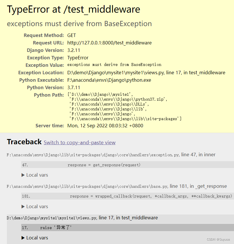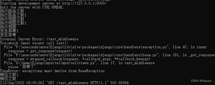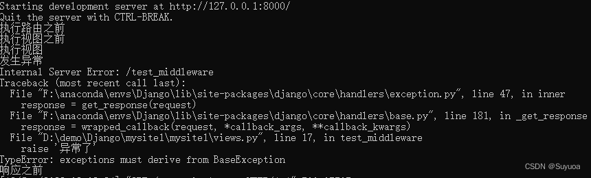 正常来说是不会走发生异常的(访问为定义的路由也不会触发process_exception),我们如果要出发异常必须配合python的关键字raise