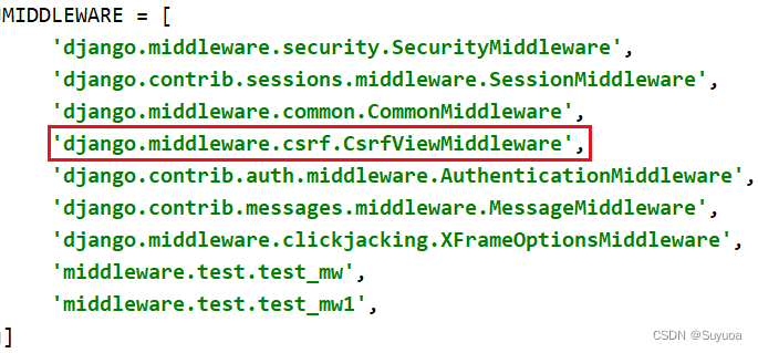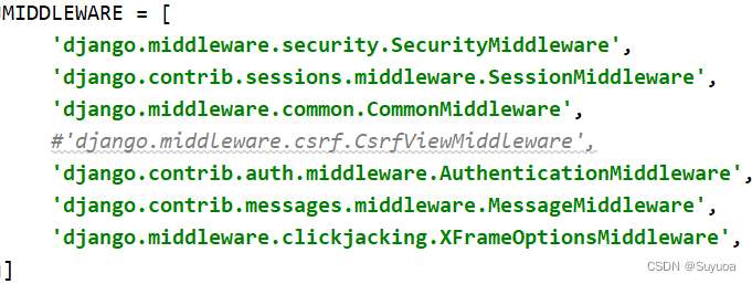 - django.middleware.csrf.CsrfViewMiddleware csrf(跨站请求伪造)保护,跨站请求伪造大致意思是你登录了A网站后没有推出,然后你登录了B网站(同一个浏览器打开两个标签页),然后B网站获取到了A网站的信息,并伪装成你给A网站发请求。想了解csrf可以看一下这个 CSRF简介_manster1231的博客-CSDN博客_csrf