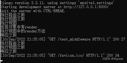 看一下终端的情况,第一个是我们test_middleware的请求,第二个是favicon(网页上的图标)我们可以忽略