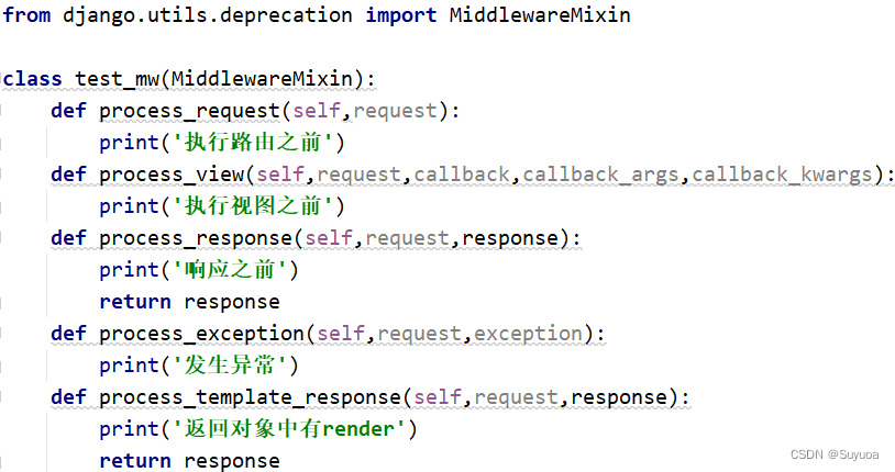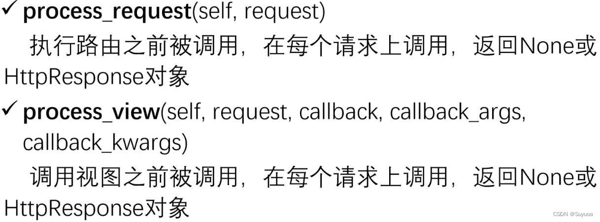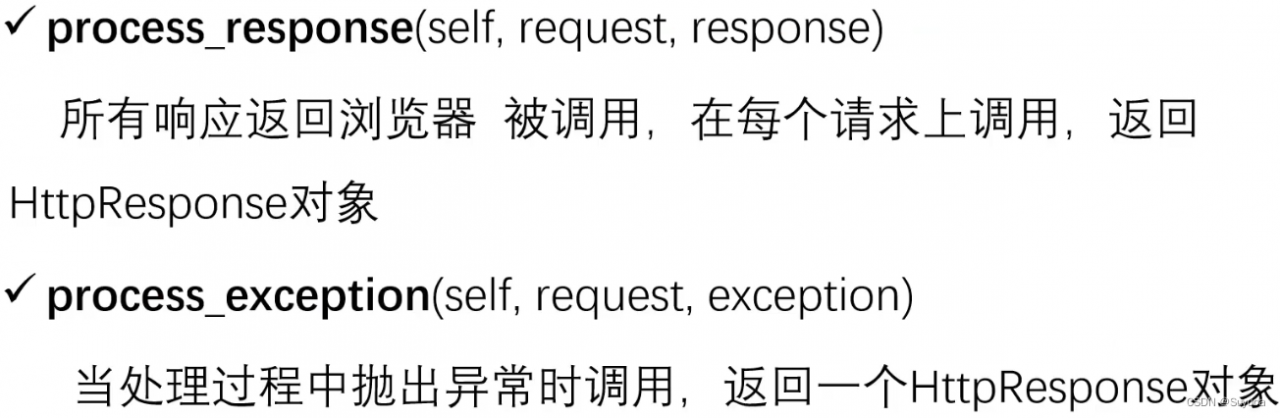 - process_response与process_template_response方法一定要返回一个response对象,不然请求就没有响应了,会报错