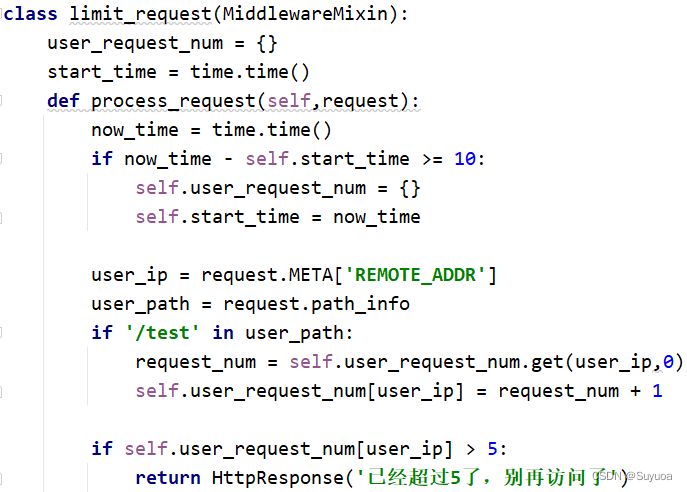 我们现在限制每个用户每十秒只能访问/test开头的地址5次,使用request.META['REMOTE_ADDR']可以得到远程客户端的IP地址,使用request.path_info可以得到客户端访问的请求路由信息