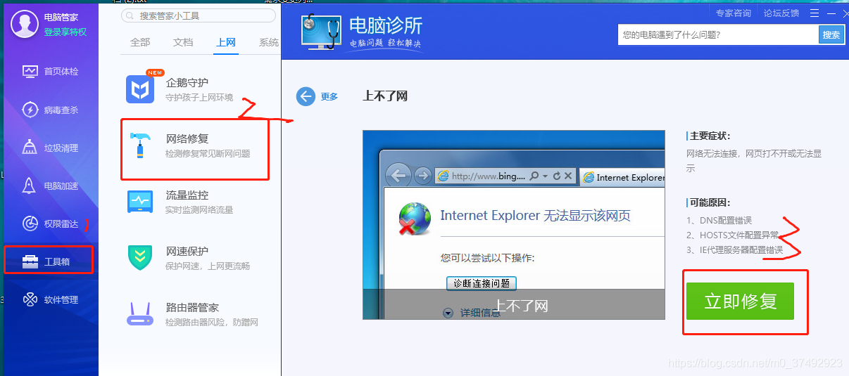 1、使用电脑管家中的网络修复,进行修复。如下图所示: