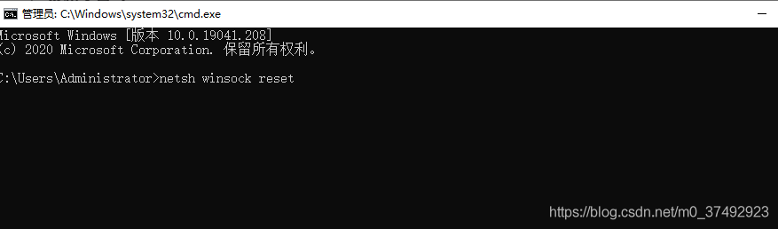 第三步:在命令行中输入 netsh winsock reset 然后按下回车