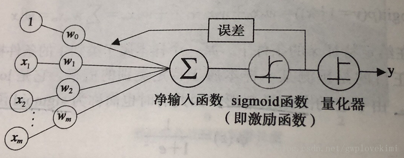 为了实现逻辑斯蒂回归分类器,在每个特征上都乘以一个回归系数,然后把所有的结果值相加,再代入sigmoid函数中(激励函数),进而可以得到一个范围为0~1之间的数值(可以看成概率)。量化器则是设置一个阈值,大于阈值则归类为1,小于则归类为0。其模型如下图所示: