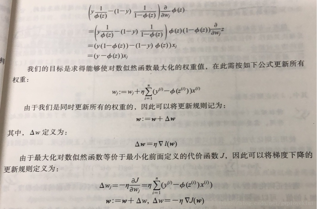 在自适应神经网络中通过最小化代价函数,就可以获得分类模型的权重w。后面的部分直接给出书上的照片吧(这个我没看太懂。。。。也没做详细的理论推导)