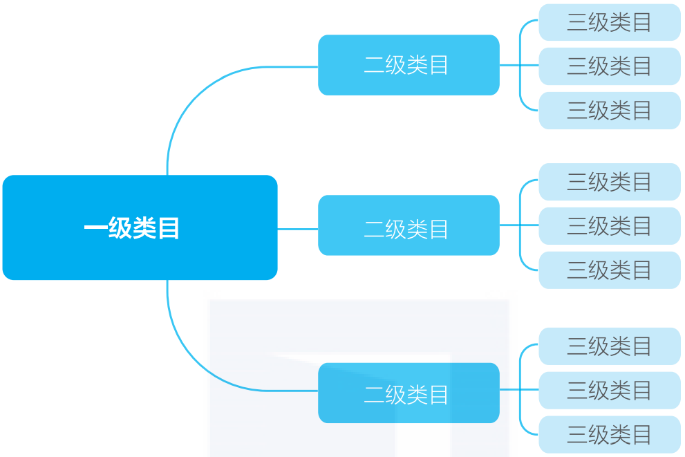类目体系指的是对某一类item(事物)的分类、架构、组织方法。类目体系结构可以用树状结构来类比,第一级分支称为一级类目,从第一级分支中长出的第二级分支称为二级类目,从第二级分支中长出的第三级分支称为三级类目,以此类推。