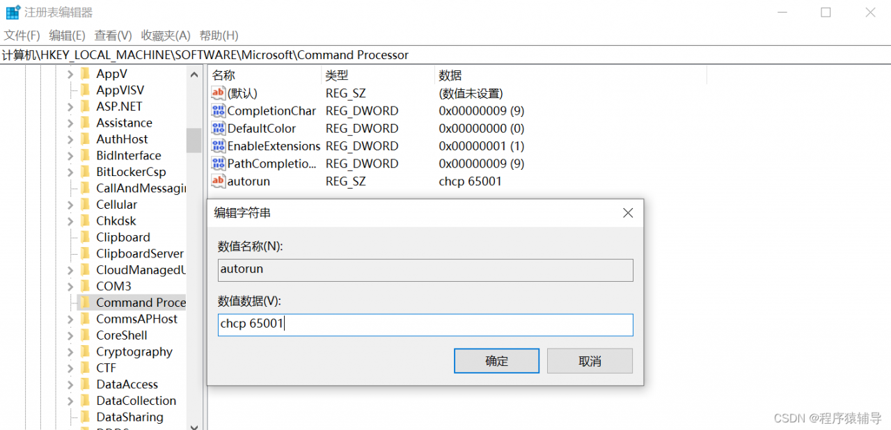 第三种:永久有效的方式,win+r,输入regedit打开注册表,按顺序找到该目录HKEY_LOCAL_MACHINE\SOFEWARE\Microsoft\Command Processor,并新建字符串值