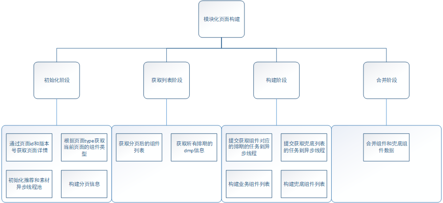 我们再进行归纳和抽象后,整个模块化的页面获取流程就可以简化为四个步骤:初始化阶段、获取组件列表阶段、构建阶段和合并阶段,如图;