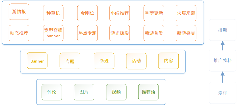 如下图3,推广物料有Banner、专题、活动、网页等;排期有胶囊banner、游情报,种草机、重磅更新等;如种草机就是网页(内容链接)加上时间组成的;整个结构呈现一个倒金字塔结构。