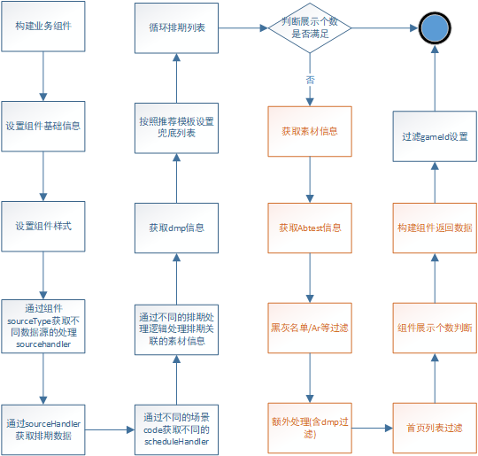 在获取业务组件中排期数据(如上图,其中也包含了游戏信息)的时候,还会有获取ABTest信息(不同的用户展示不同的游戏信息),游戏黑白名单过滤,已安装过滤,已曝光过滤,额外信息处理,组件数据组装等过程。每一个排期数据获取都会用不同的Handler来处理。每一个Handler都有自己的处理逻辑,针对如此多的排期以及他们的扩展,如果没有一套处理的统一逻辑,那么简直是灾难。新人在开发新组件中排期数据的时候,可能会遗漏非常多的细节。另外,推广物料之间其实是有一些通用逻辑,如果不将这些逻辑沉淀到领域模型中,逻辑无法复用,将会散落在各个Handler中,我们以下图橙色的步骤来详细说明。
