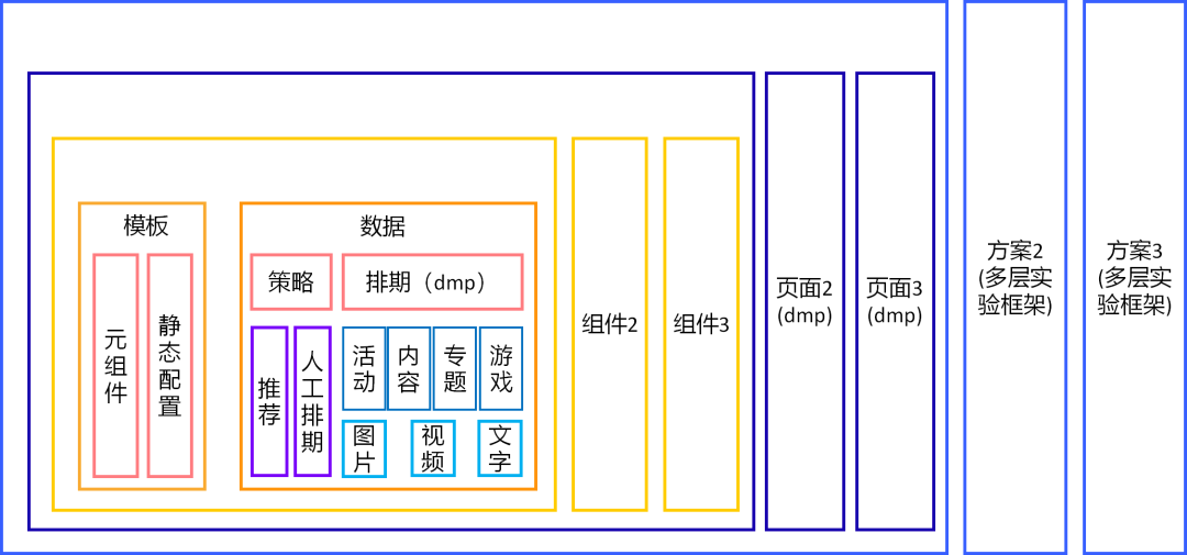 大家可以看到,三个功能分别对应了三个概念。组件化对应了组件,配置化对应了页面,实验化对应了方案。它们是包含的关系,即一个方案包含了若干个页面,而一个页面也包含了若干个组件。