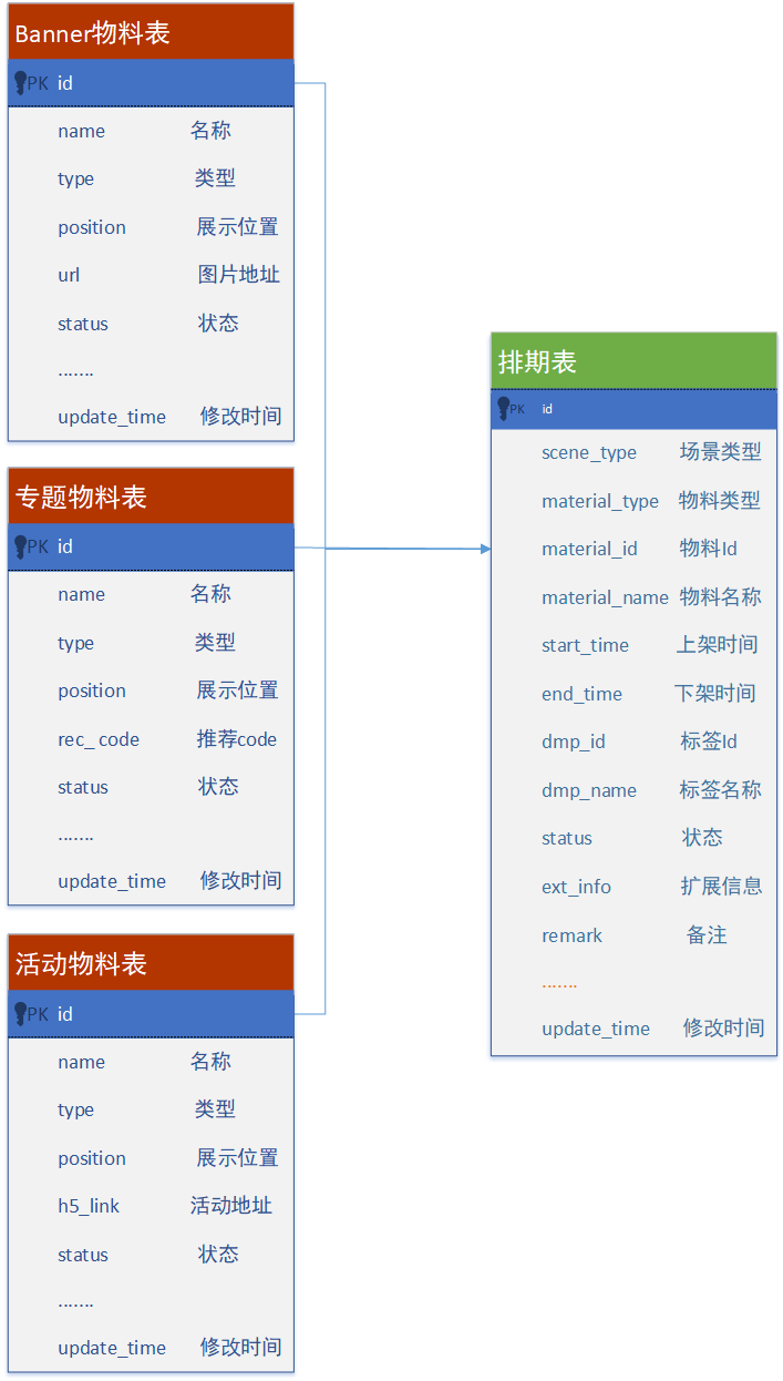 模块化之后,我们将游戏中心所有的资源位都当成一个个模块,也就是都可以看成是排期数据,我们只需要两张表就可以做到排期三维数据的展示:排期数据表以及排期关联的具体素材表。因此我们在设计排期表的时候, 将素材信息(如图4中的material_id和material_type)数据保存在排期表中, 将DMP或者其他统一的信息也保存在排期表中, 这样做的好处就是对所有的排期都能生效统一的流程。