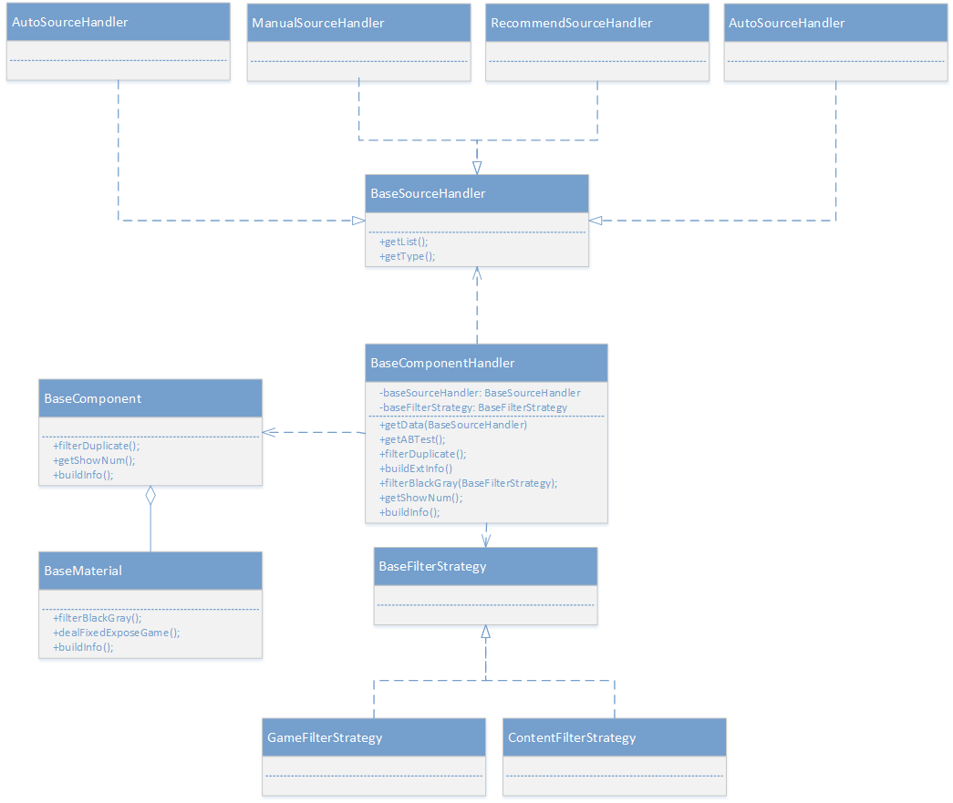 一方面,我们将获取并处理推广物料的流程统一化。如下图所示流程中,其实基本上就包含了所有推广物料需要处理的步骤逻辑(不重要的步骤已忽略)。统一之后,我们可以将一些通用的逻辑下沉,形成统一的方法调用。比如我们可以根据人工排期,推荐排期等,采用工厂方法的设计模式来屏蔽获取推广物料的逻辑。当然我们为了提升性能,对于人工排期数据,利用统一缓存的方式,通用场景code来获取;接着利用不同过滤策略来过滤掉进入黑灰名单的游戏或者内容。处理完额外信息之后再用列表的数据将组件中重复的数据给去除。