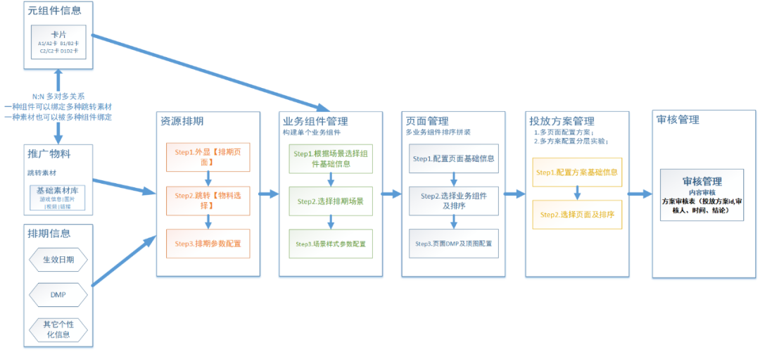 如此复杂的业务流程,肯定少不了后台的配合。素材,推广物料和排期的统一后,我们也将后台的配置流程标准化。