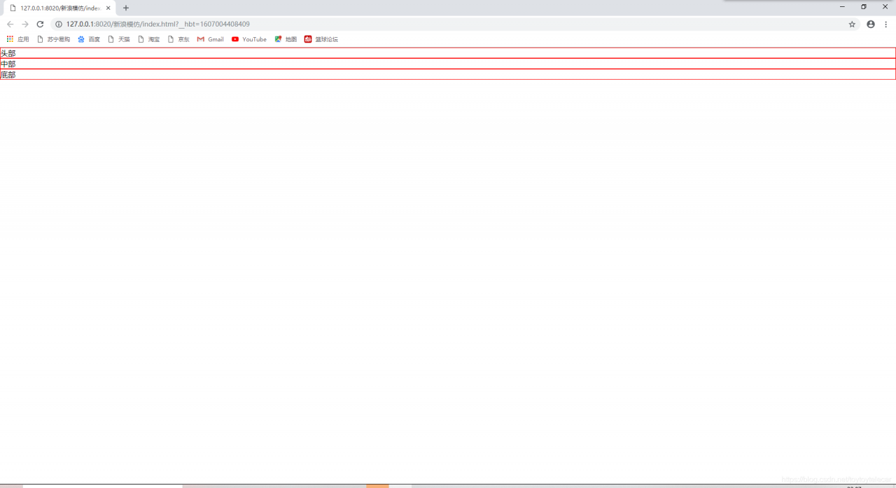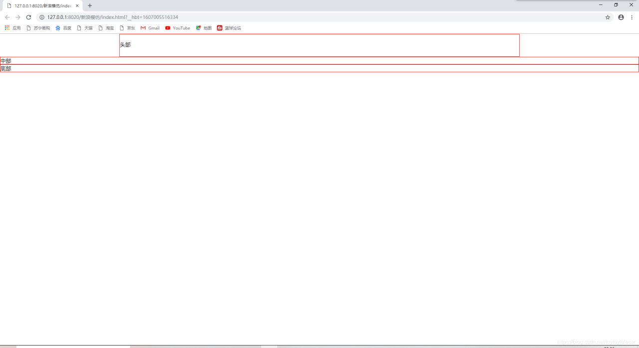 所以为了系统的把控全局页面,我们先写出大致的轮廓,并且在每一个部分加上边框方便观看: