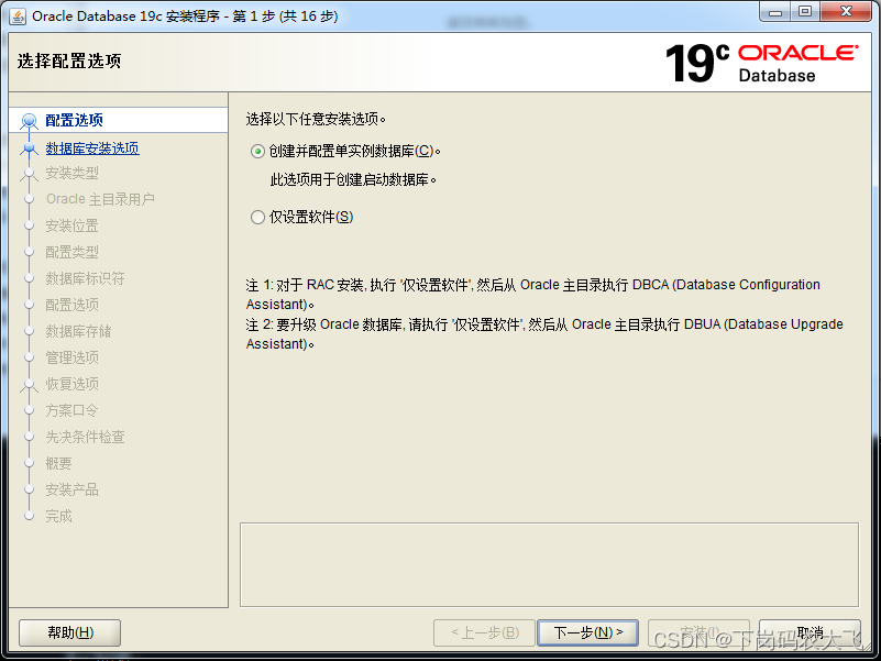 Oracle中将一个数据库服务称之为一个实例, 这里注意, 如果选择仅设置软件,需要在安装软件成功后, 自己配置数据库实例。选第一个默认会创建名为:ORCL的实例