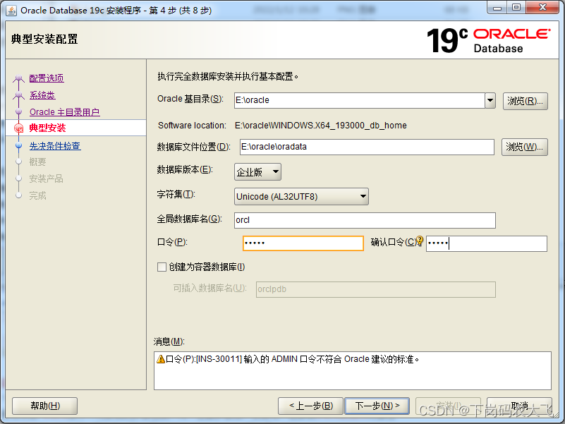 注意:初学者不建议勾选 : 创建为容器数据库,因为很多好用的用户需要额外折腾才能使用