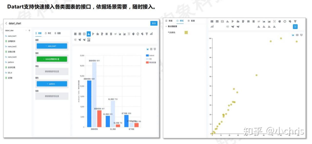 作为一款BI开发和数据展现工具,datart与国内BI工具相比,路线不同,作为开源的可视化工具,模块更清晰,数据开发模式简单便利,图表展现方式更为丰富,管理权限体系强大。