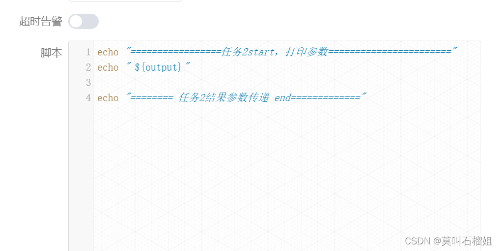 但是上述的例子也是仅仅key后面跟的常量参数,事实上我们需求往往都是需要动态传参数的,上述的shell的这种静态传递参数给下游其实是没有意义的,因为如果是静态的,我们为什么不选择in中输入参数呢?如下图所示: