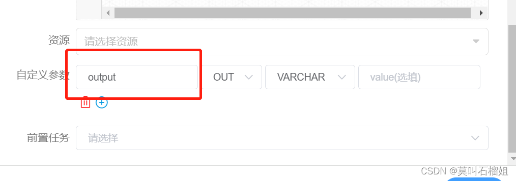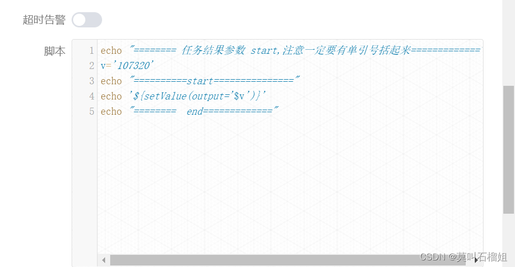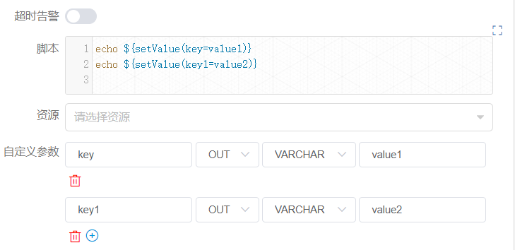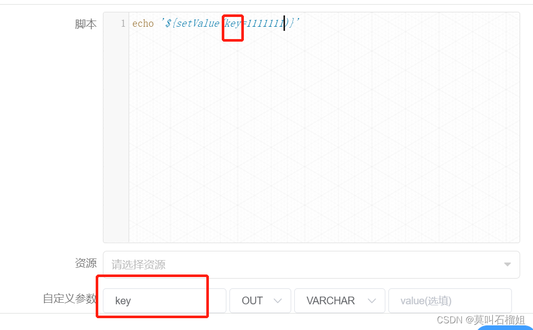 echo '${setValue(key='$value')}'注意此处等号左边的key需要和自定义输出的参数key名字一致