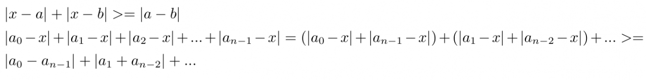① 设最终所有数字都变为了x,那么移动的最少次数实际上求解的是下图中所示的绝对值不等式,因为最终需要使得步数最少,也即需要使得下图中不等式中的等号成立,所以每一段区间都需要将点取到区间内(可以取到区间端点处),并且只有令x取中位数的时候等号才是成立的,所以我们需要计算出数组中的中位数,然后计算每个数与中位数的差值,将这些差值相加那么就是最终的答案。