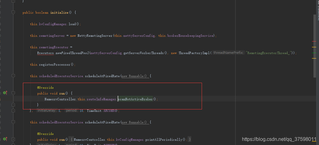 NamesrvController.this.routeInfoManager.scanNotActiveBroker();