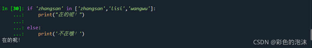 in 与 not in 是python独有的运算符 (全部为小写字母),用于判断对象是否在某个集合中,非常好用,并且速度很快,返回结果为布尔值类型的 True 或 False。
